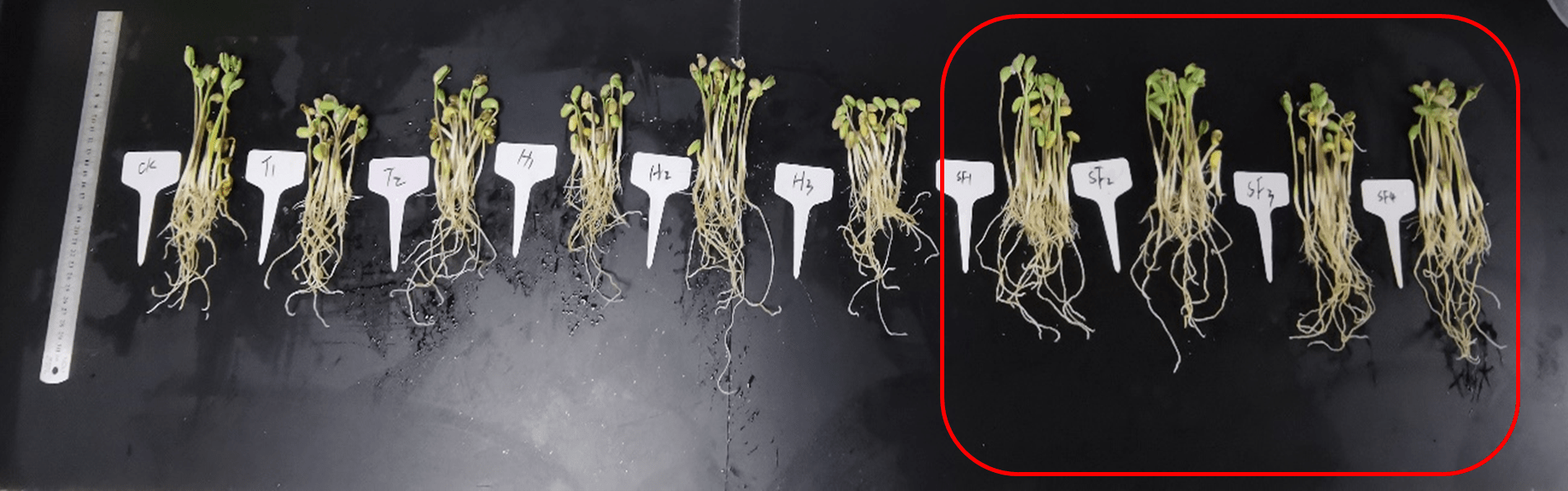 (2)測試了在低溫與高溫條件下,花粉多糖對大豆幼苗生長的影響。對比其他生物刺激素,花粉多糖在高低溫逆境條件下,可顯著促進大豆根長、莖粗及鮮重增加,其中高溫條件下大豆根長根重分別增加了20.45%、55.58%,顯著優(yōu)于其它生物刺激素效果。