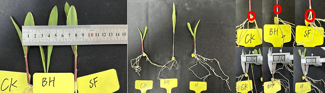 (1)針對玉米作物:在14℃~22℃培養(yǎng)條件下,對比其他種子處理劑,采用50g/100kg花粉多糖進行玉米拌種處理,試驗27天后發(fā)現(xiàn),花粉多糖處理后玉米株高生長雖弱于其他種子處理劑,但莖粗、根鮮重、氣生根長出率及氣生根根長均顯著優(yōu)于,其中明顯看出其他種子處理劑處理后,玉米未生長出氣生根。說明花粉多糖拌種玉米,可明顯增加玉米氣生根生長,提升玉米后期抗倒伏能力。