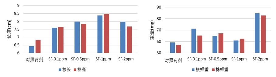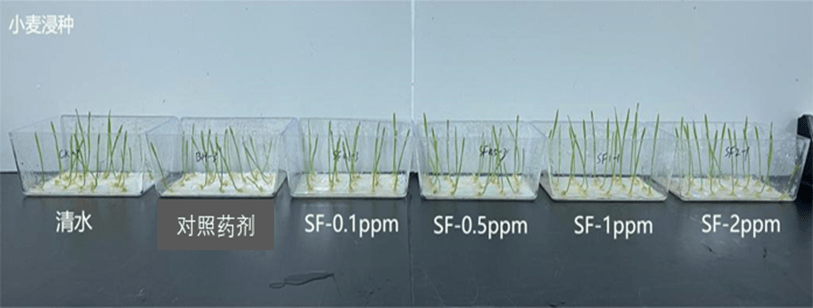 (2)針對小麥作物:浸種處理后發(fā)現(xiàn),試驗范圍內(nèi)的花粉多糖對小麥株高、根長、株重、根重均具有促進作用,其中在2 ppm處理下,相比陽性對照處理,花粉多糖處理后小麥株高、根長、株重及根重分別增長12%、24%、45%、43%。
