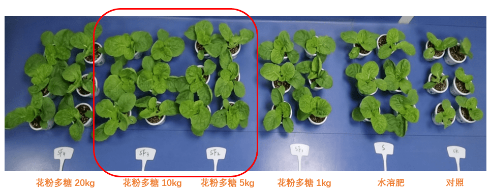 (1)花粉多糖復(fù)配水溶肥提效增產(chǎn)。在水溶肥中添加5-10kg/t花粉多糖,可促進小白菜光合作用,顯著提高葉綠素含量10.97%,促進小白菜葉片生長,地上部生物量增加34.0%-41.78%;同時,水溶肥復(fù)配花粉多糖,能提高小白菜的營養(yǎng)品質(zhì),促進葉片Vc含量及可溶性糖含量積累。